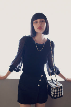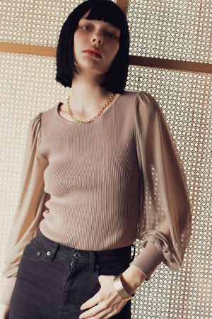 袖はボリューム感がありますが柔らかい素材のためアウターも羽織りやすくなっております。