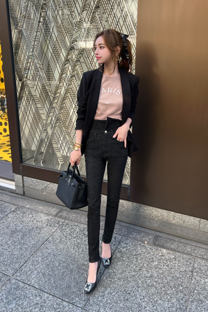 ハイウエストなので脚長効果はもちろん、ウエスト周りに視線を集めて全体のスタイルを良く見せてくれます。