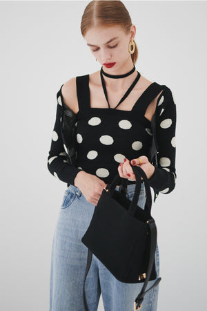 幅広のショルダーストラップと細めのホルターストラップのコントラストがデコルテの華奢魅せ叶える優秀デザイン。