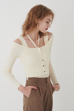コンパクトなミニマルシルエットはどんなボトムにも相性抜群。 カーデの広めのボートネックには、同シリーズのホルターネックキャミでバランス良く仕上げたトレンドムードな着こなしがおすすめ。