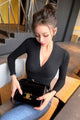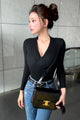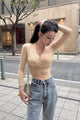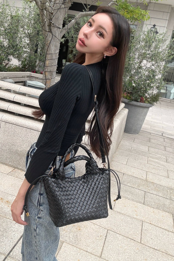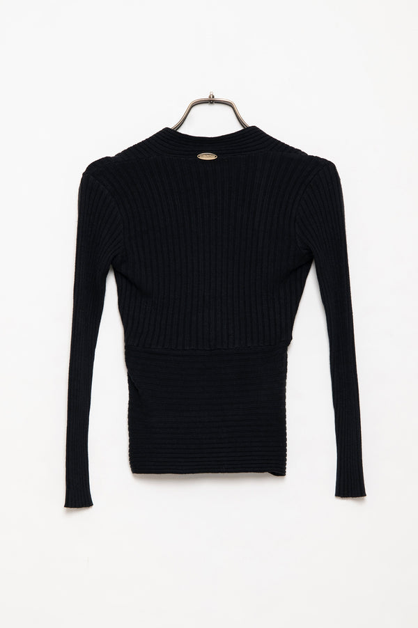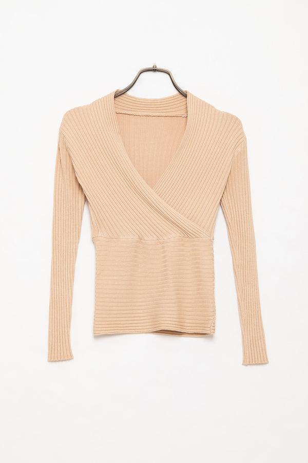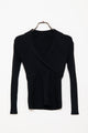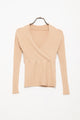 上品なフィット感でメリハリあるボディラインを描きつつ、折り返しのオフショル仕様が二の腕をカバー◎