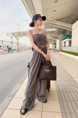 アシンメトリーなボタン配置がこなれた印象を生むデザインビスチェと、柔らかな揺れ感の艶っぽワイドパンツ♡