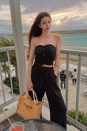 ベアトップのパンツドレスのようにクールに着こなせるセットアップアイテム。