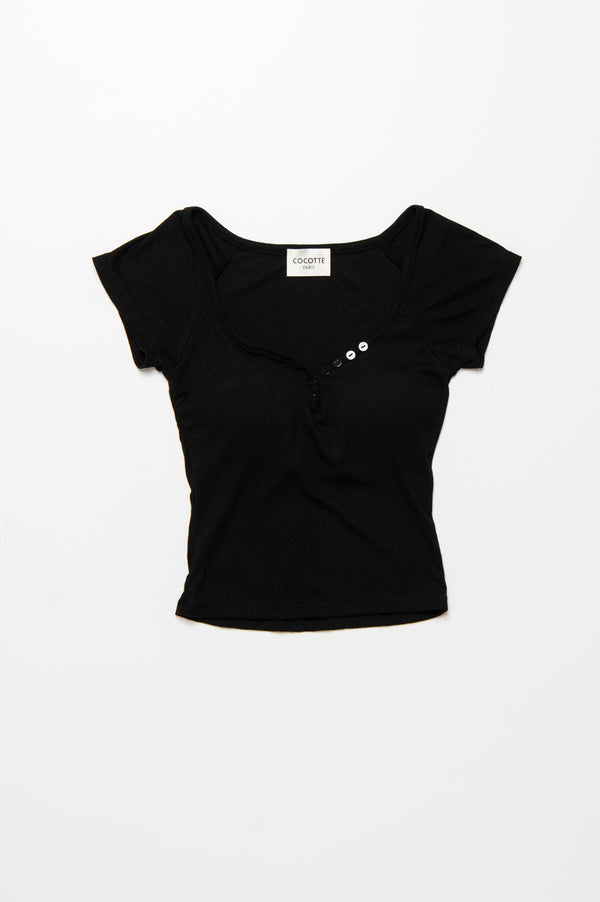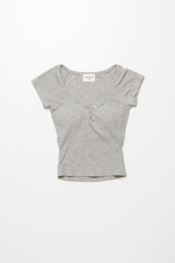 ヘンリーネックのボタンデザインが、シンプルな中にアクセントをプラスする一枚。