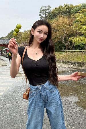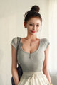 「さりげないディテールが映える、リブヘンリーネックカップ付きトップス」
