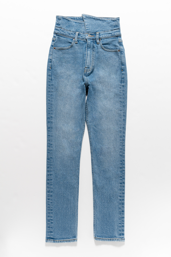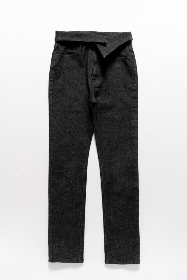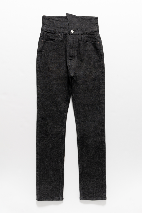 アシンメトリーなウエストデザインがモダンな印象のスキニーデニム。