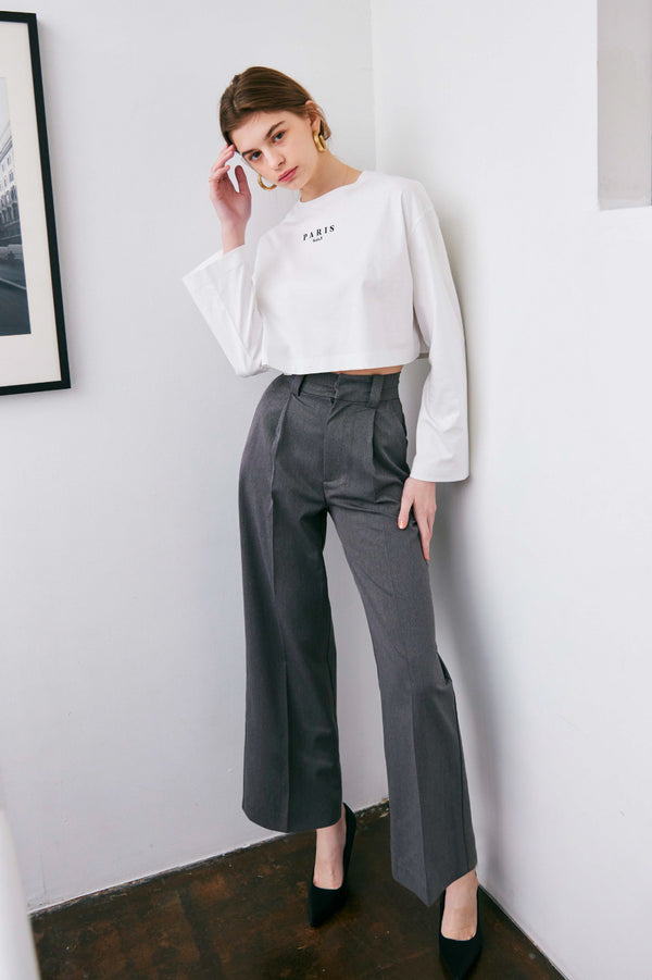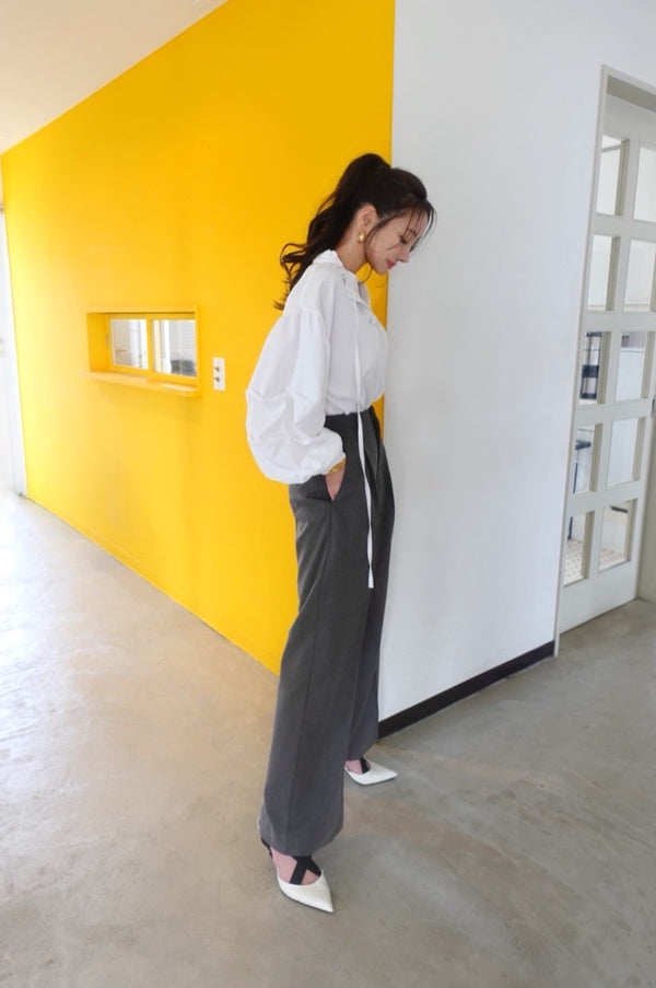 ハイウエストなのでショート丈のトップスやウエストインできるトップスと相性がいいです。
