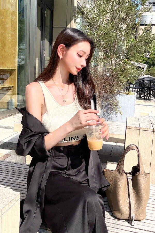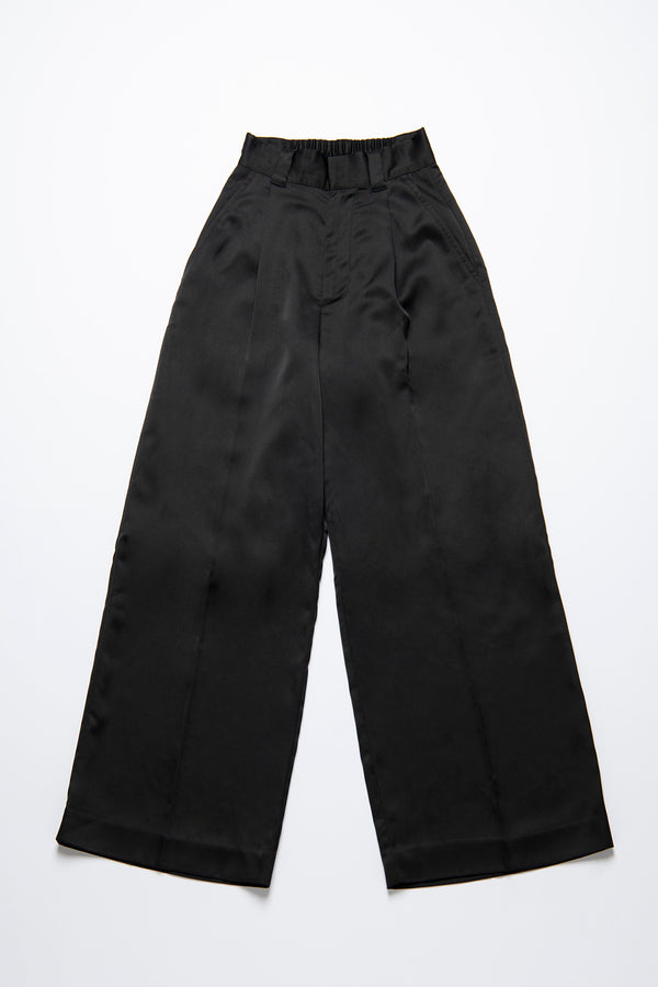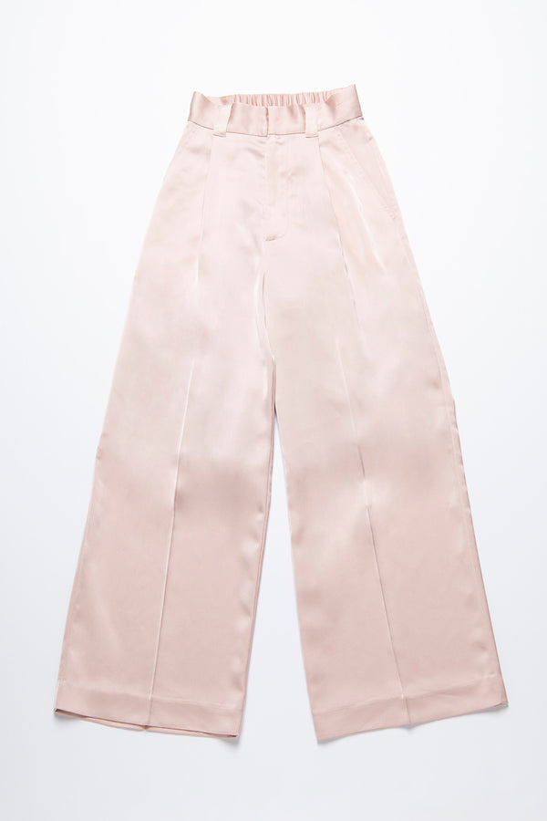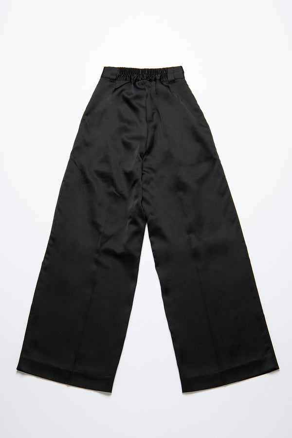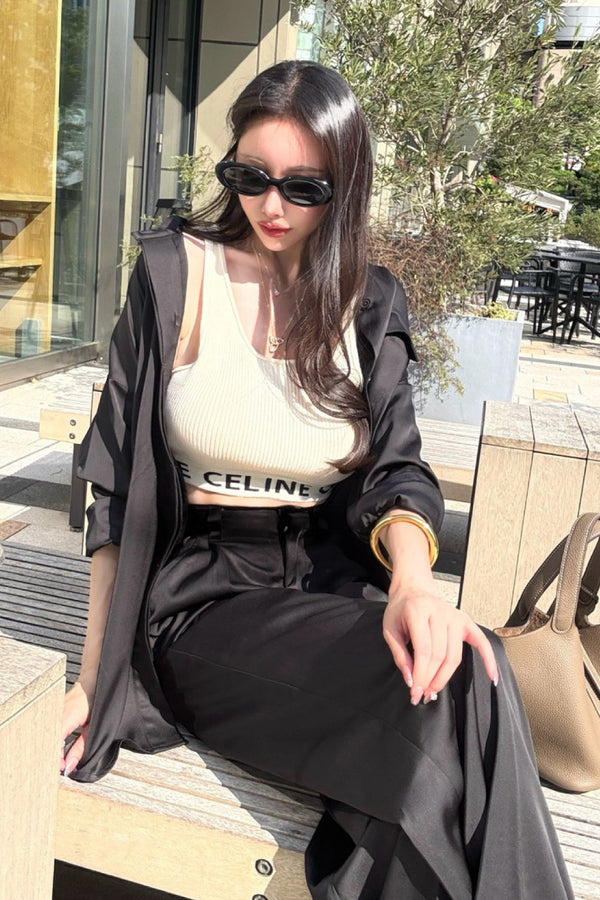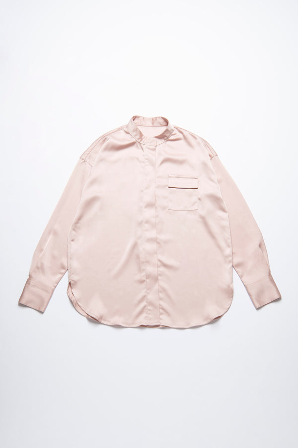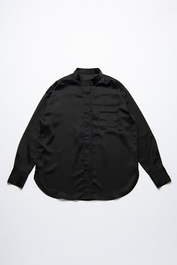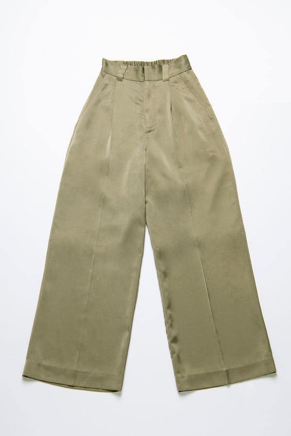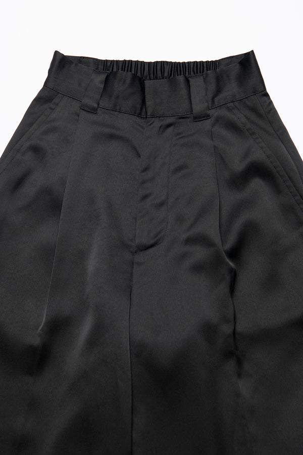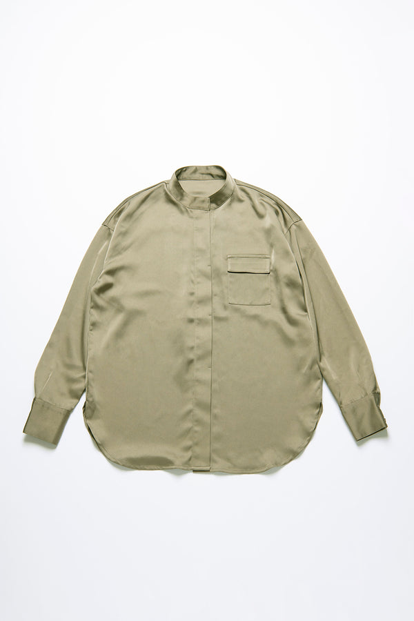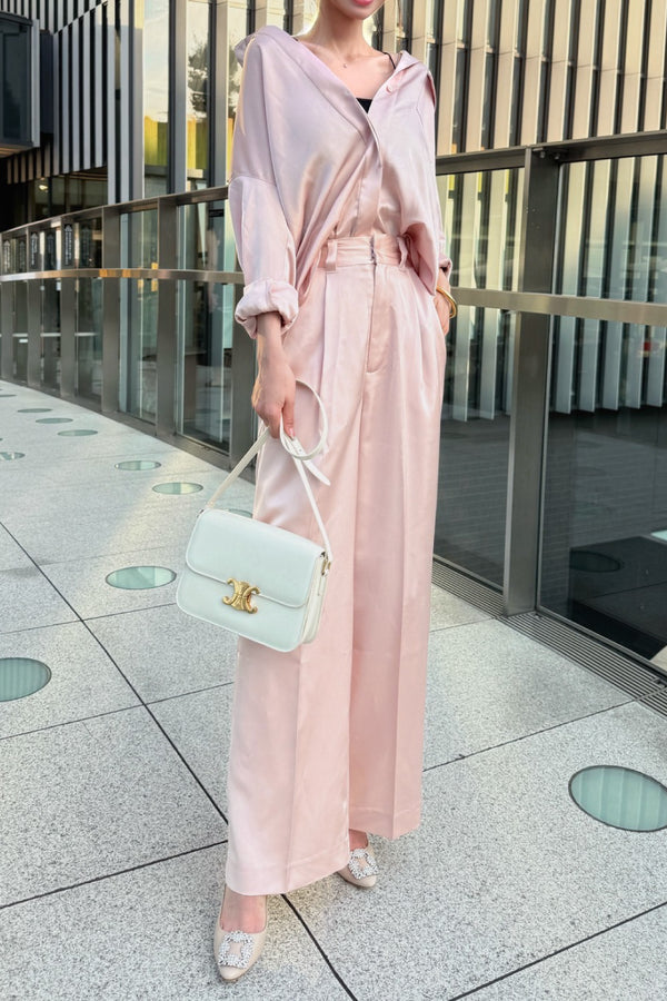 ボタンを開けてもシルエットが綺麗なスタンドカラーシャツと、細過ぎず太過ぎないベストバランスの筒幅でリラクシーでもルーズ過ぎない、極上の綺麗魅せにこだわったサテンパンツ。