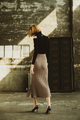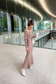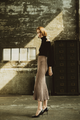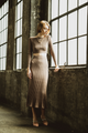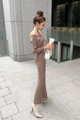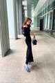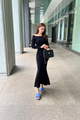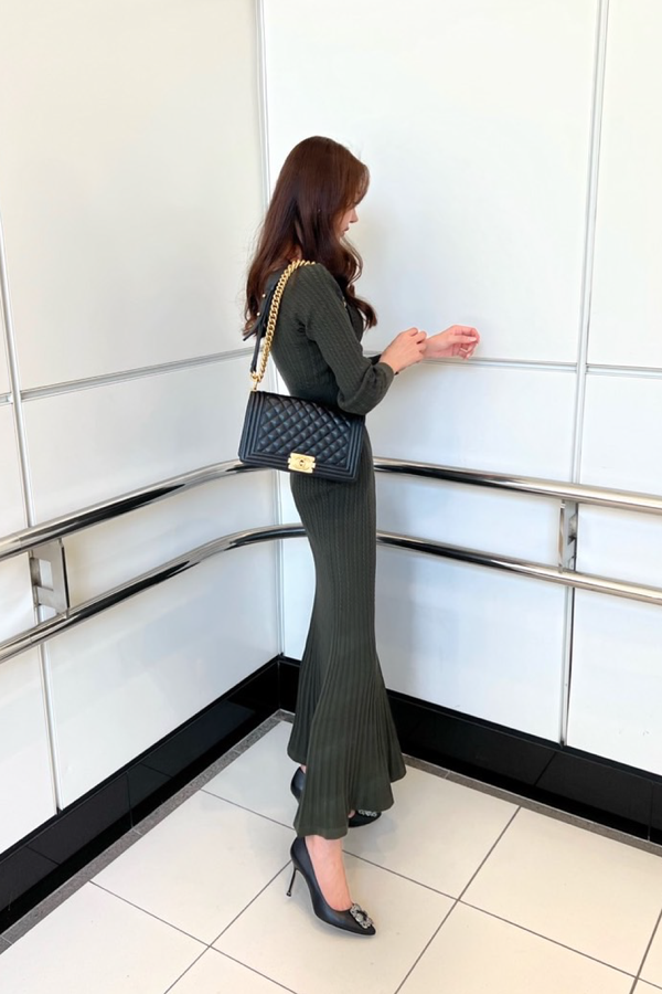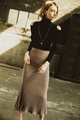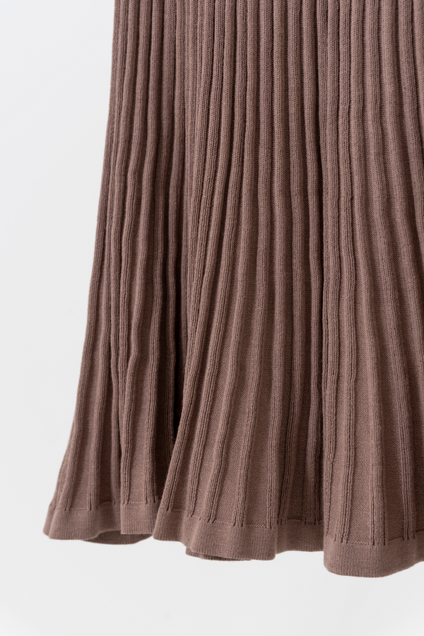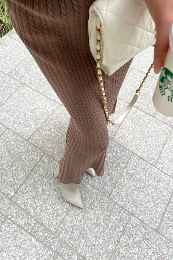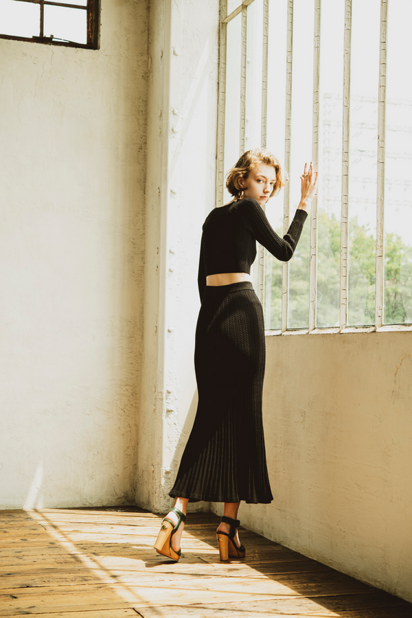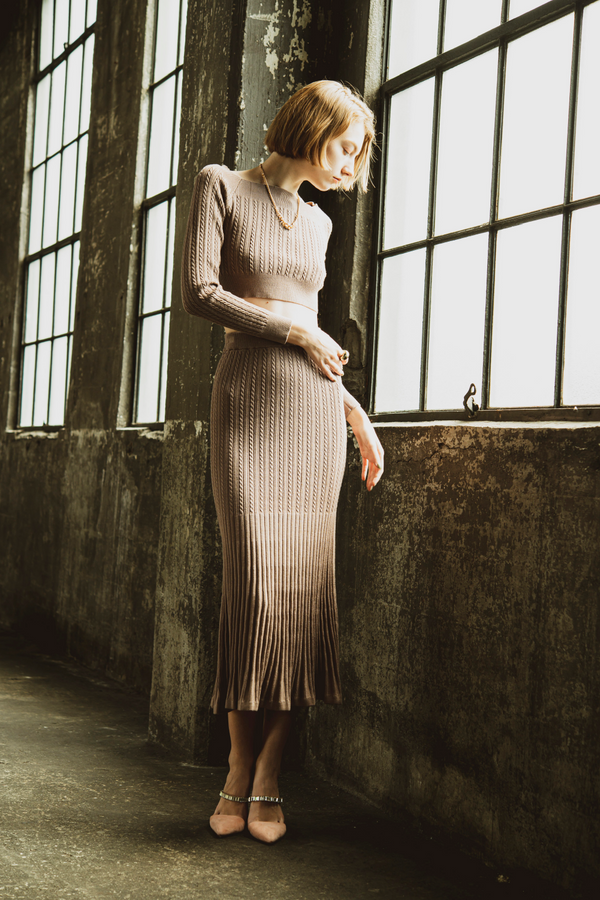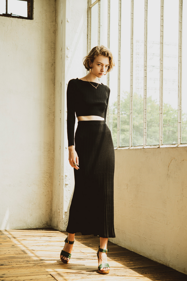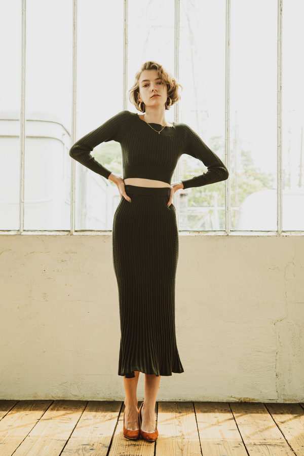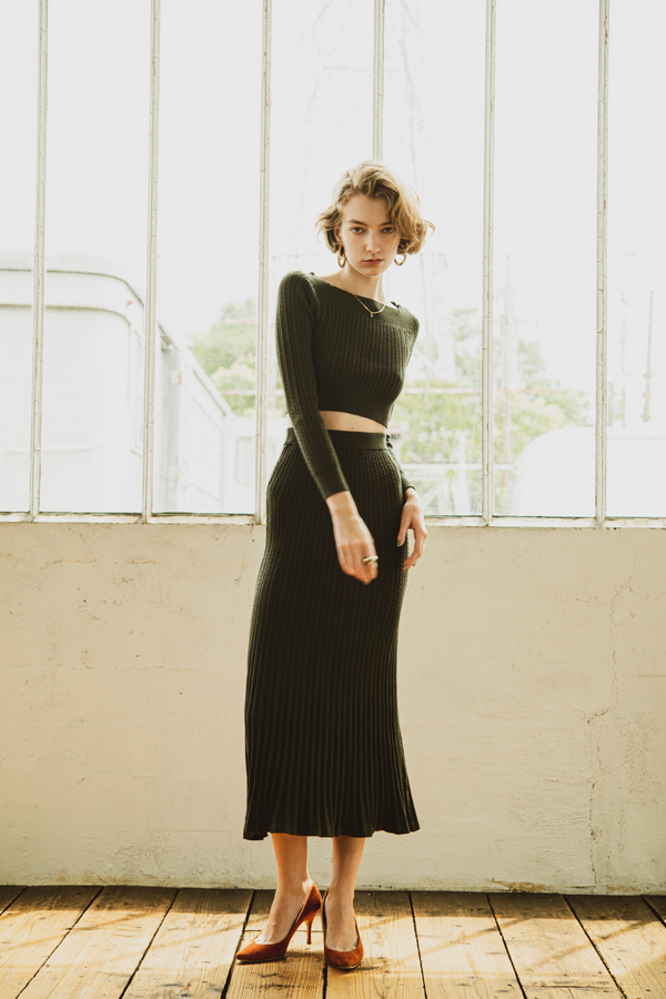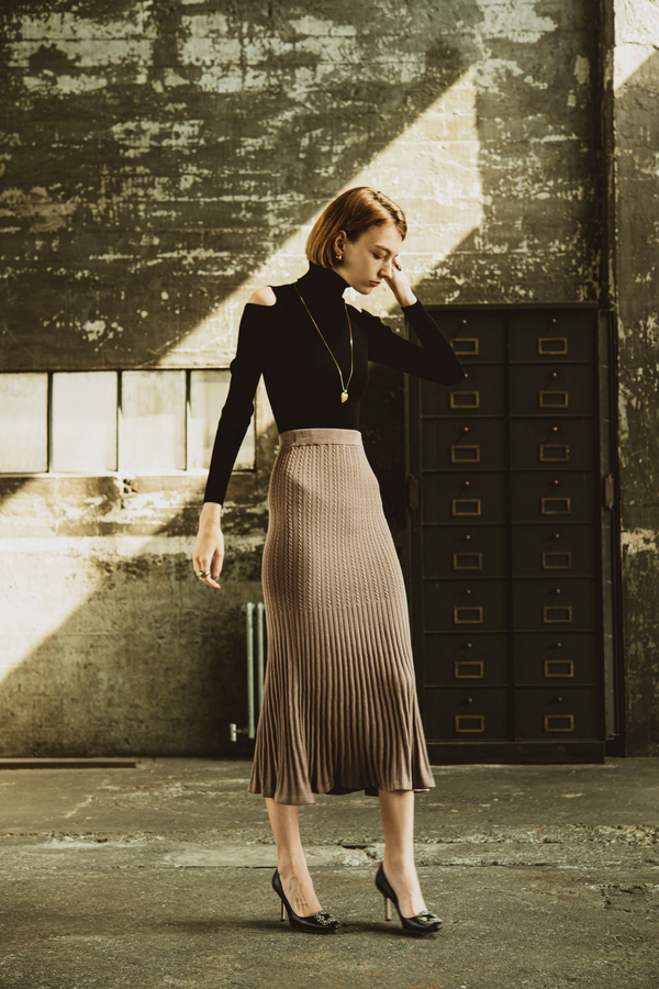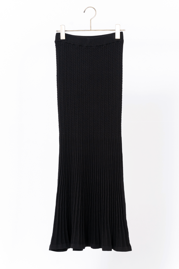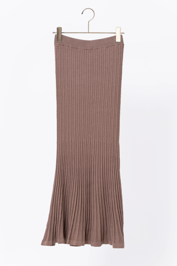 ミニケーブルとリブの編み地のマーメイドシルエットのニットスカート。