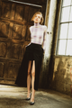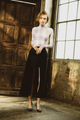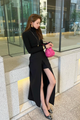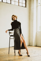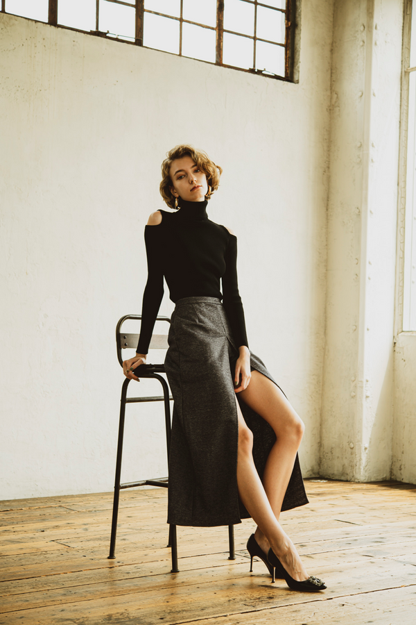 適度な肌見せが女性らしく、すっきりとしたシルエットで大人っぽい印象に。