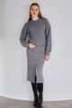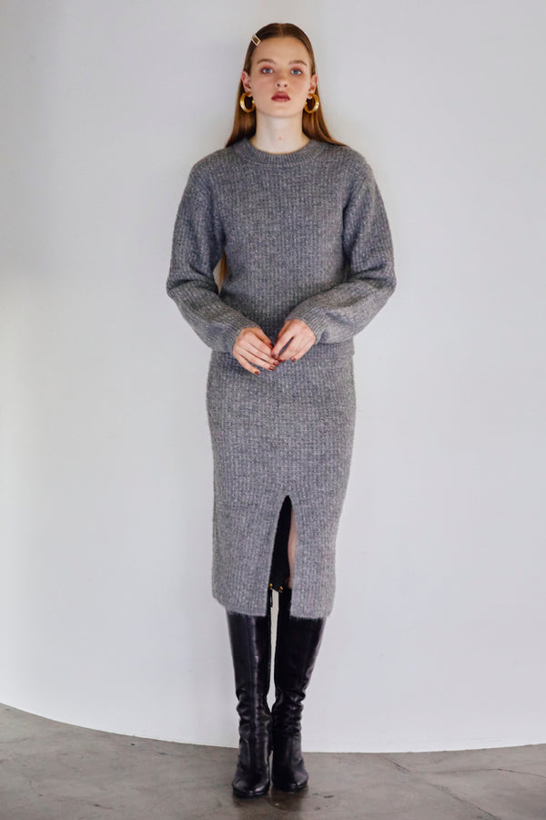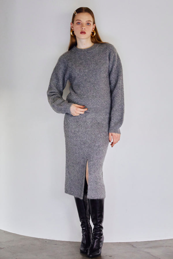 ふんわりとした女性らしい生地感にモードさも感じられるシルエットの組み合わせが◎