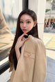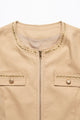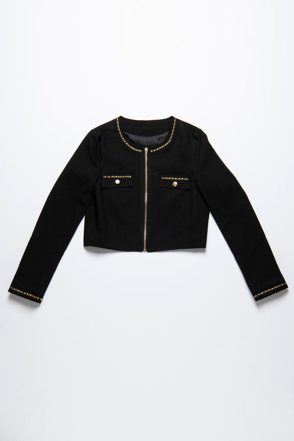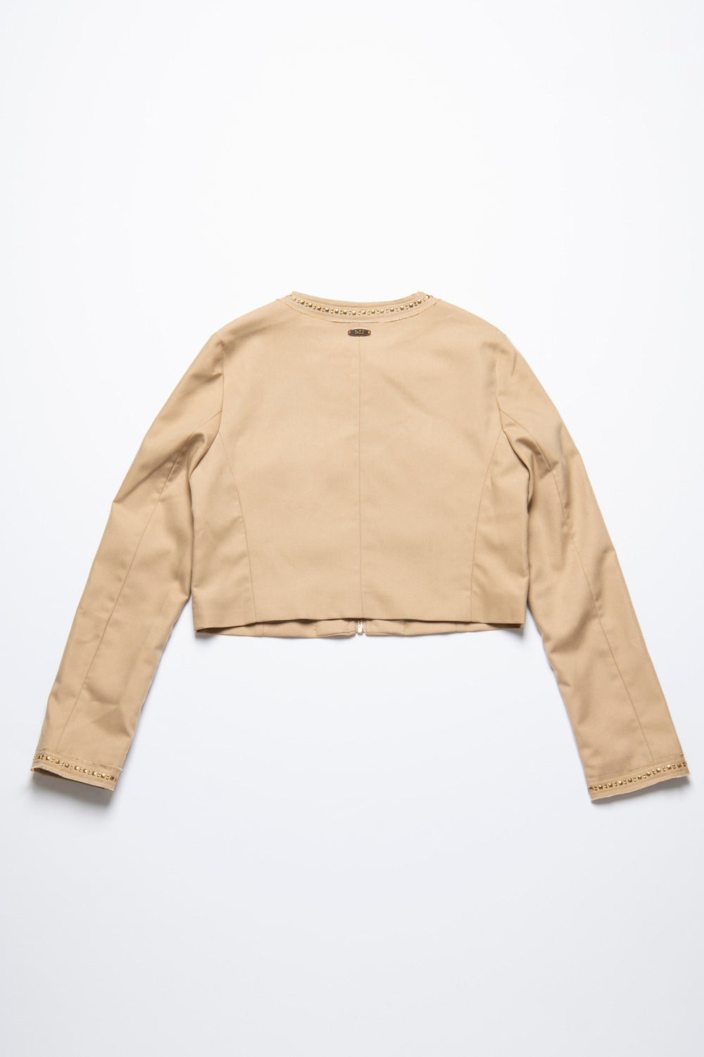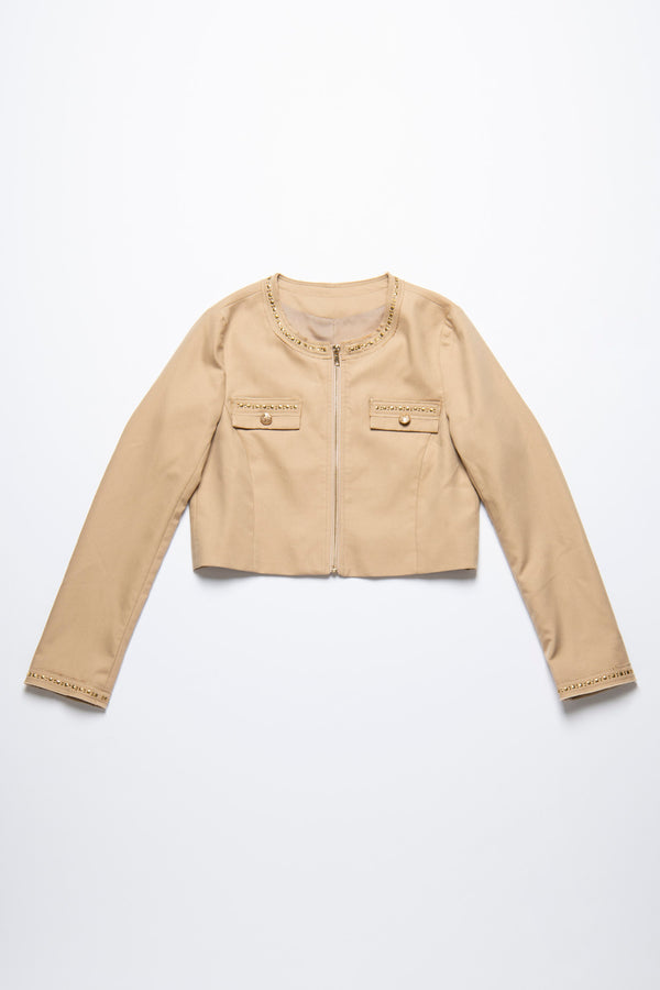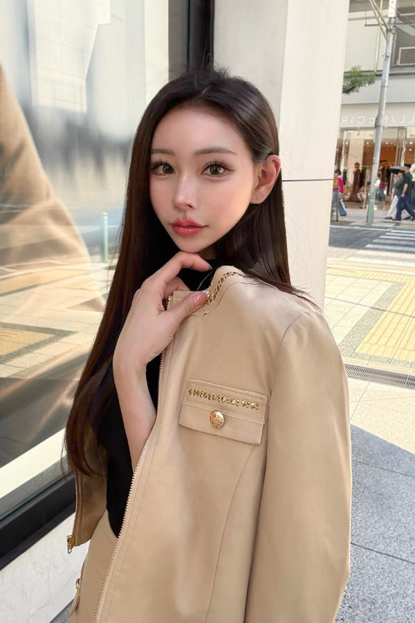 ノーカラーのノーブルなシルエットにスタッズデザインでアクセントを効かせたショートジャケット。