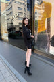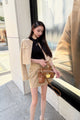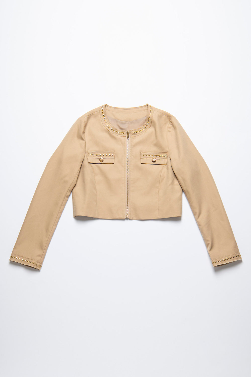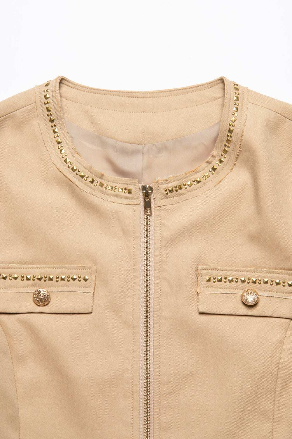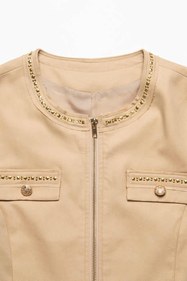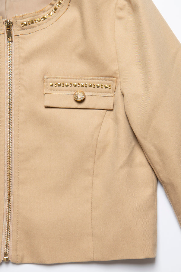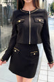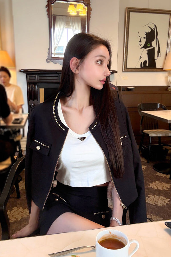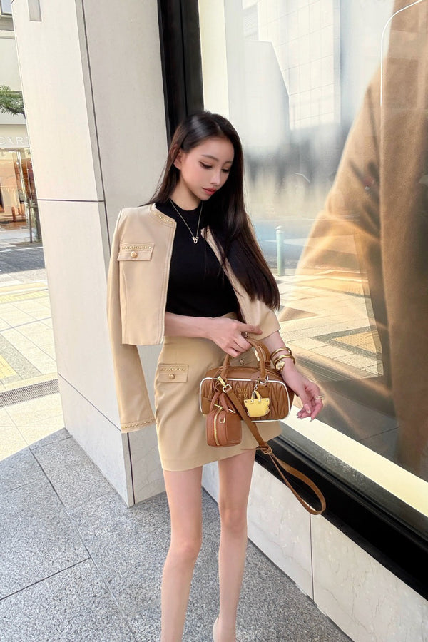 ノーカラーのノーブルなシルエットにスタッズデザインでアクセントを効かせたショートジャケットと、綺麗なウエストのカーブデザインでくびれシルエットを描くこだわりフォルムのミニスカート。