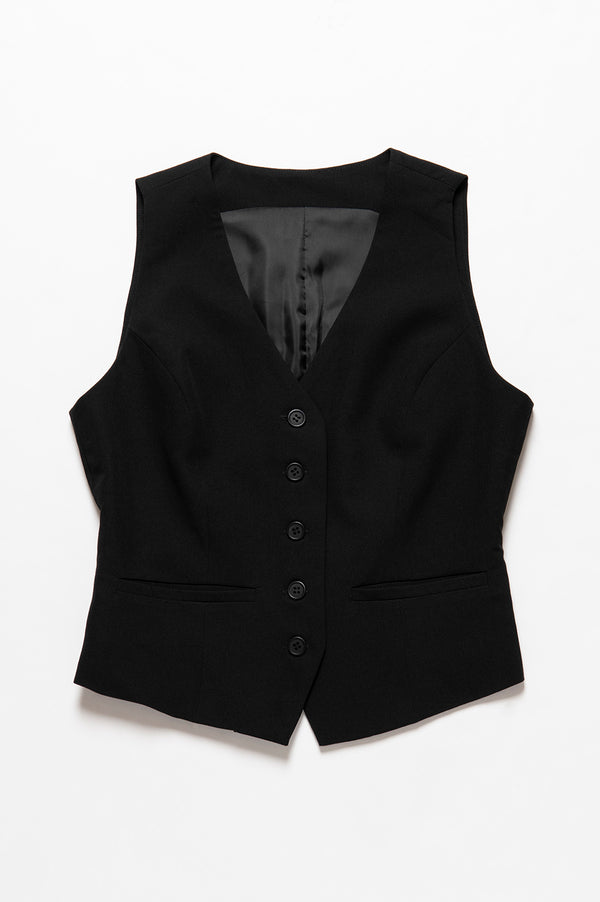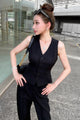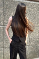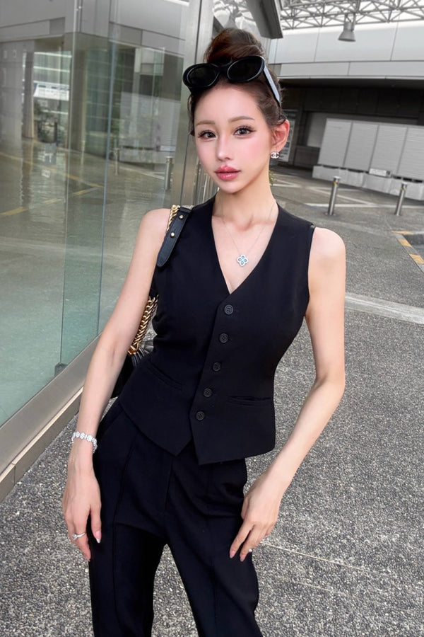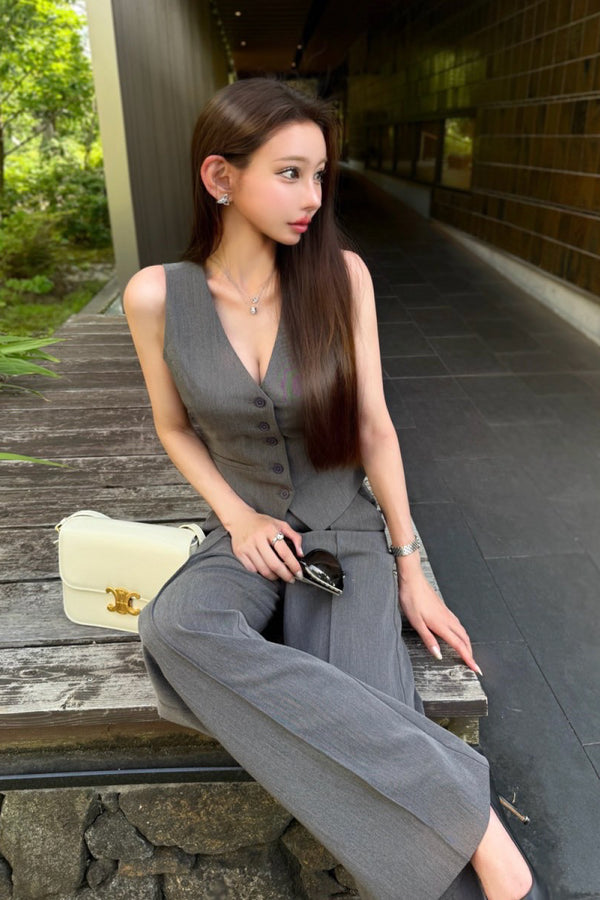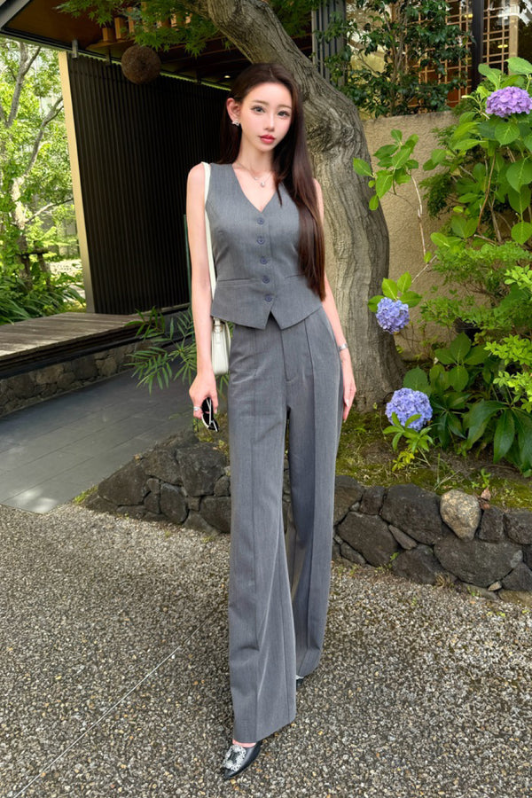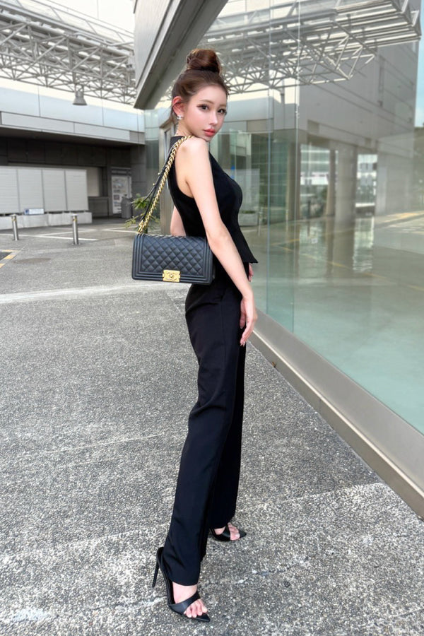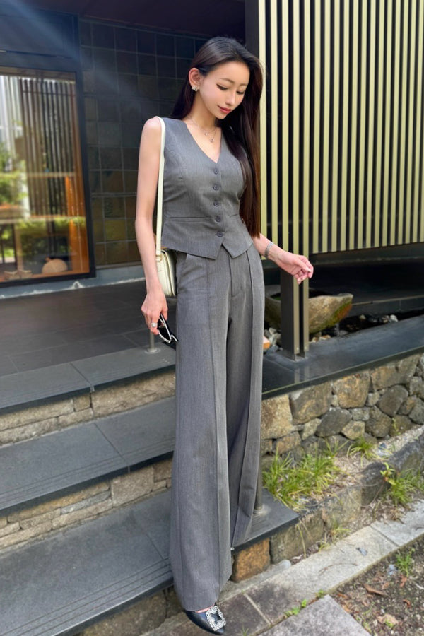 ハイウエストでくびれるジレのタックラインや、足捌きが良くしなやかに揺れるトレンドムードなフレアパンツもポイントです。