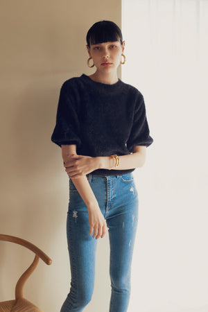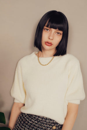 緩やかなパフスリーブデザインなので甘すぎない大人ニットです。