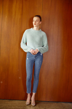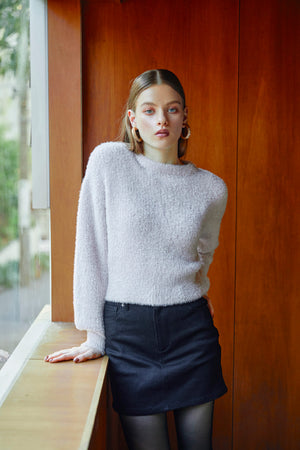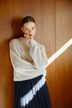 全体的にゆるっとしたシルエットで仕上げておりますので、程よく抜け感がありながらもおしゃれに着れるニットになっております。袖は少し長めに仕上げ裾は少し短くすることにより、ゆるっとしながらもスタイルにメリハリをつけてくれます。