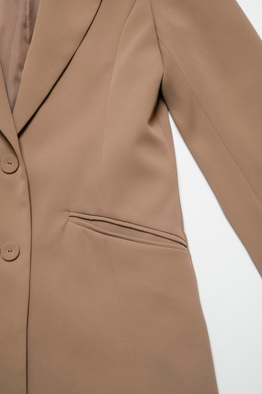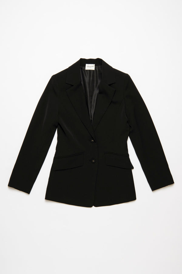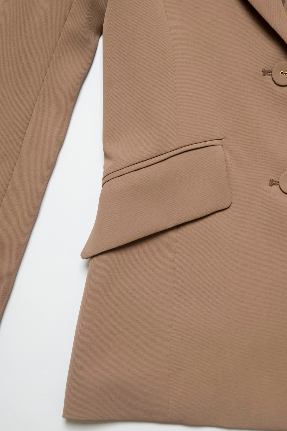 シャープなテーラードカラーと、ウエストラインに沿った立体的な切替がポイント。