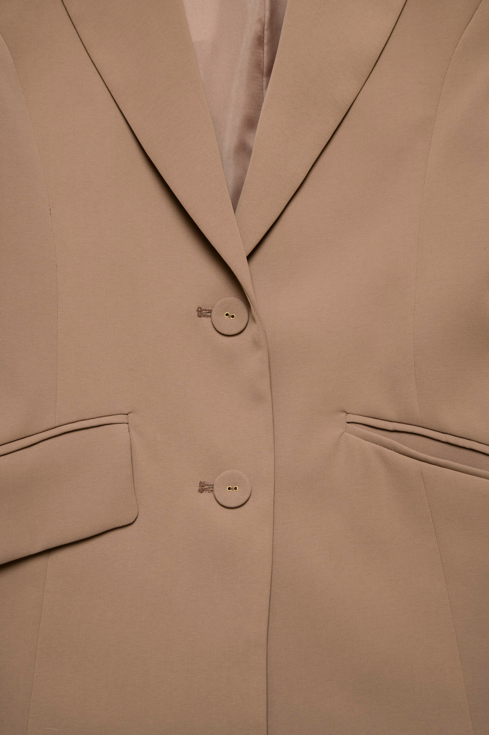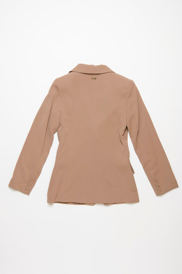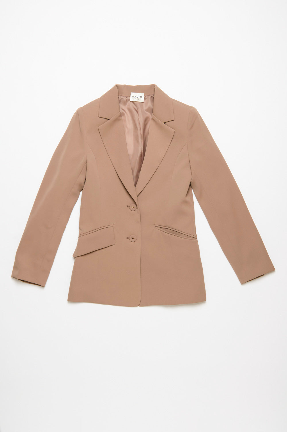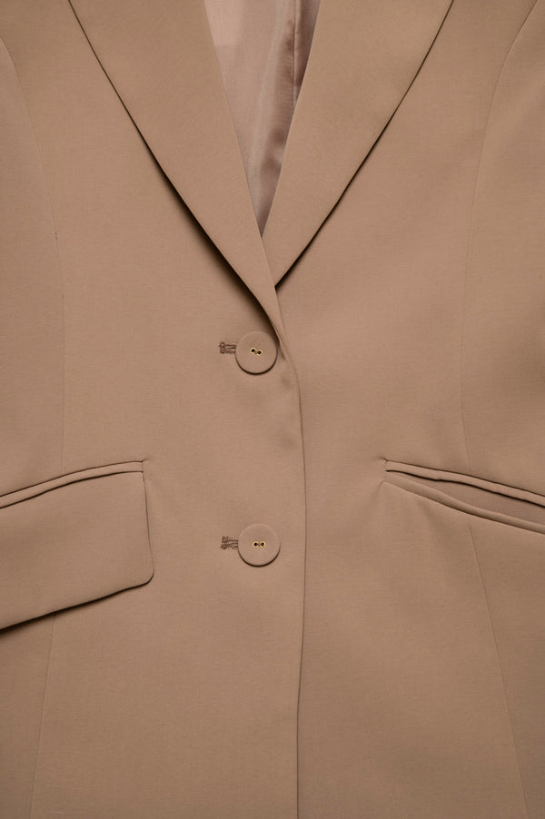シャープなテーラードカラーと、ウエストラインに沿った立体的な切替がポイント。